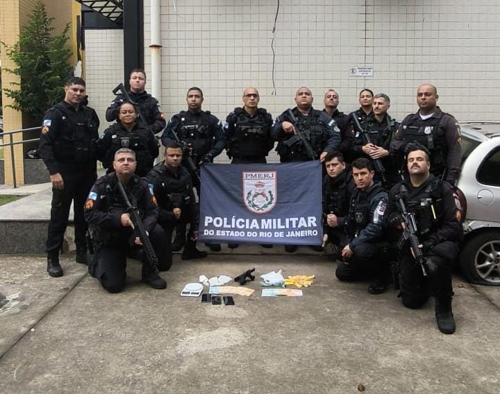 Uma pistola 9mm com 16 munições, cinquenta pinos de cocaína, uma bucha de maconha, R$ 3.330,50 em espécie, uma balança de precisão, material para embrulhar drogas e três celulares. O suspeito, juntamente e o material, foram gentilmente conduzidoz pelo uber do 29 à 143ª DP/ Itaperuna, onde foram tomadas as medidas cabíveis.