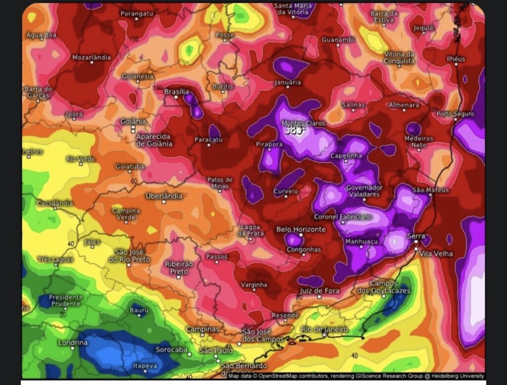 Embora a maior concentração da chuva esteja prevista para a faixa que abrange o Espírito Santo, o Vale do Rio Doce e o norte de Minas Gerais, o sinal de alerta se estende para áreas como a Zona da Mata e o Campo das Vertentes. Municípios como Juiz de Fora, Cataguases, Ubá, Muriaé, Barbacena, Carangola e Manhuaçu podem registrar acumulados pontuais entre 100 e 175 mm-milímetros.