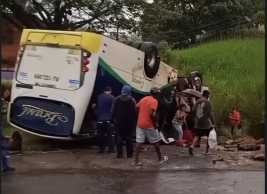 Cerca de 30 pessoas precisaram de atendimento médico depois do capotamento de um ônibus da...